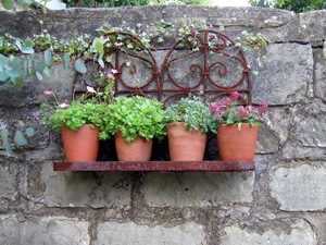 まずはお馴染みのテラコッタですが、小さめのテラコッタをいくつかまとめて棚に並べたり、ラスティ(錆感のあるアイアンをあしらった棚)などを合わせています。
