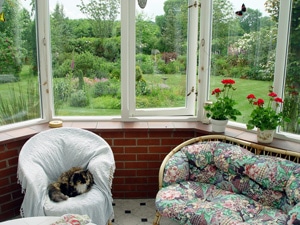 コンサバトリーの中に何気なく置かれた白い陶器製の鉢カバーにペラルゴニウム(ゼラニウム)の赤色が目に鮮やかです。