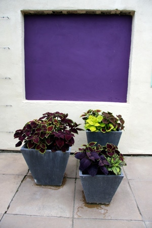 シンプルモダンでまとめた例です。 高さの違う鉛色のコンテナを3つ使い、後ろの紫のウォールにあわせて紫色を含むカラーリーフで寄せ植えしています。
