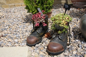 履かなくなった革靴とか、古いチムニーなど、なんでもコンテナにしてしまいます。