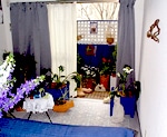 パティオは、スペインやラテンアメリカなどの、建物に囲まれたタイル貼りの中庭で、周りや三方を建物に囲まれた、敷石の中庭などをこう呼びます。 |
