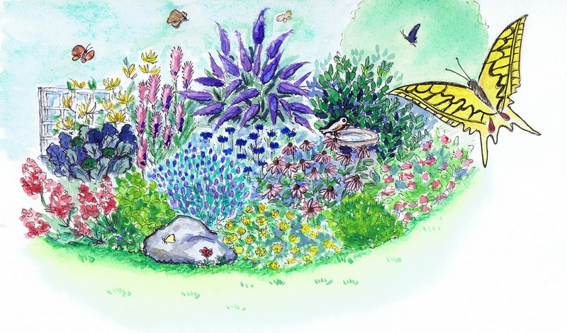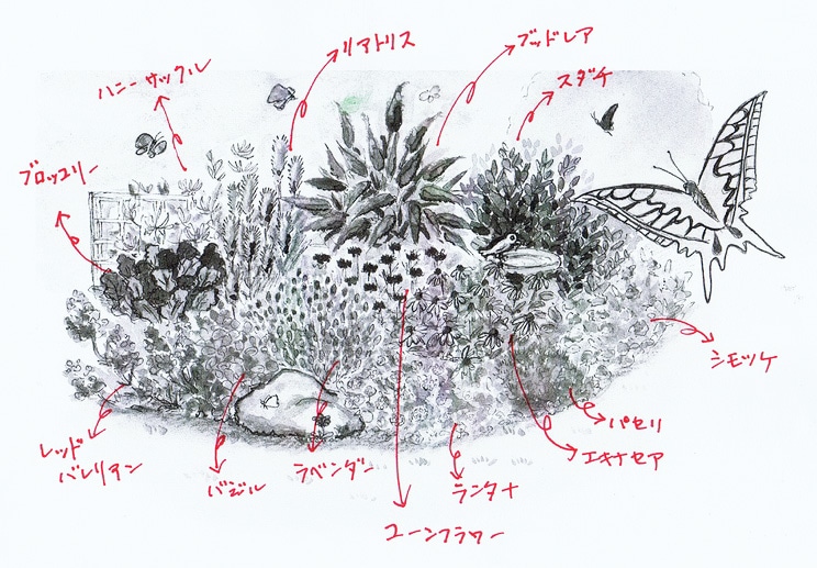 特定のチョウを呼び寄せたい人は、もう少し詳しく幼虫の食性やチョウの好む蜜源となる植物を調べて、植えてみてくださいね。一般的には前ページの植物リストなどを参考に、自分のイメージに合った、バタフライガーデンをお作りください。