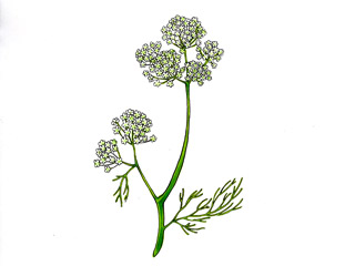 メソポタミア文明のころから利用されてきました。和名のイノンドはスペイン語から、中世ヨーロッパでは魔よけや媚薬として利用されてきました。葉は青みのある緑色で、黄色の小花を散形花序に咲かせ、卵形の平たい種子が実ります。種や花はピクルスやビネガー、オイルに漬け込み、種子はスパイスとしても使われ、ティーは胃の不快感、腸内ガスを軽減する働きがあります。