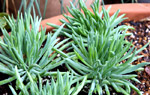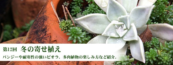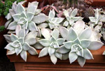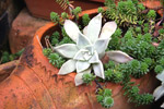●多肉植物にも色々あります。春から秋が生長期で冬休眠する夏型、秋から冬、そして梅雨前まで生長して、夏に休眠する冬型。そして、真夏と真冬に半休眠する春秋型など。それぞれの多肉植物の性質に合わせて、管理する必要があります。どのタイプにも言えることは、休眠期に水を控えること。夏型のものは生長期に長雨があって、鉢の土がしめったままになると、根ぐされの原因になるので気をつけます。また、冬型のものは高温多湿を嫌うので、夏は風通しの良い北側の半日陰などで、管理します。そして、春秋型は真夏の真冬は水やりを控えめに管理します。 |