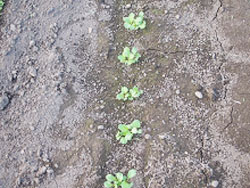 直播を行う時は、予め30cm間隔で3~5粒の点まきを行い、発芽後、本葉が2~3枚で1本に間引きます。