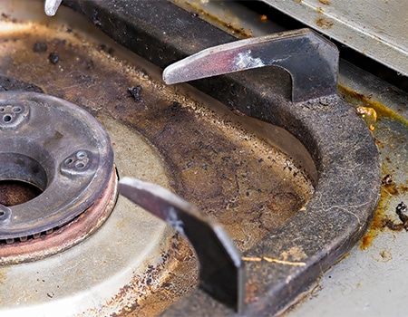 油汚れの目立つ、ガスコンロとレンジフードがセットになったクリーニングプランです。