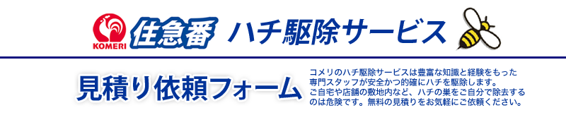 ご入力いただいた内容を確認後、4日以内(※)で業者よりお客様へ、電話にて見積を行います。 (現地見積は行いません) ※日曜・祝祭日・年末年始・お盆期間は除きます。 その際、下記内容を確認させていただきます。 ・ハチの種類 ・巣の大きさ ・戻りハチ対策(※) ※戻りハチ対策とは、ハチの巣除去後に戻ってくるハチに対処する方法です。 (オプション作業となります。) 具体的には以下のいずれかの方法で行います。 1.ハチの巣除去跡にトラップを仕掛け、捕獲する 2.ハチの巣除去跡に薬剤をまき、ハチが近寄らないようにする |