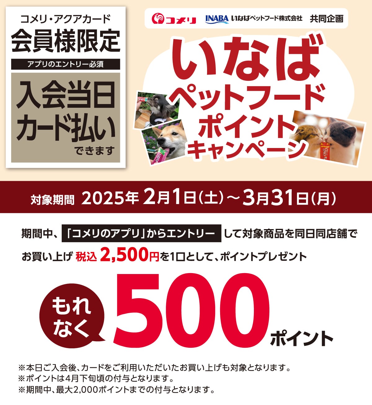 このキャンペーンは終了いたしました。 店頭でのお会計時に対象のカードをご提示ください。 コメリドットコムで宅配注文される場合、事前にマイページで対象のカード番号10桁を登録、または対象カードでお支払いください。 対象商品 対象商品を探す ※メーカーの検索結果に飛びます。キャンペーン対象外の商品も表示される可能性があります。 犬フード 猫フード キャンペーン一覧に戻る