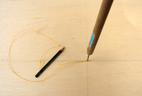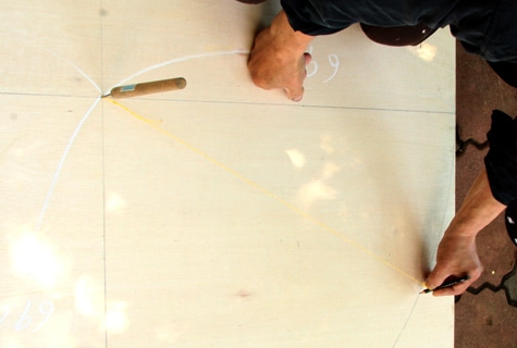 コンパネに半円アーチのカットラインを引きます。 |