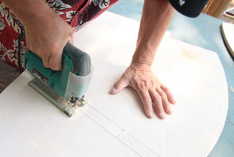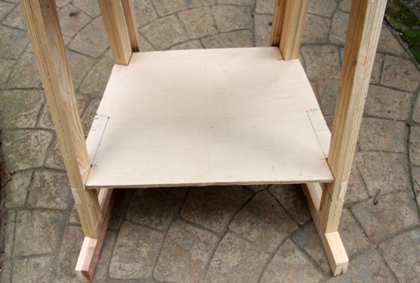 角度があり難しい棚板寸法の作り方ですが、フレームの開き角度に合わせ、板上に骨枠をのせ、直接ペンでマークします。