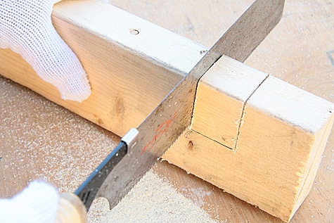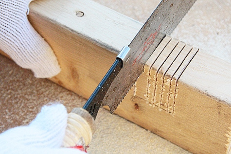 ノコギリを使い、ラインに沿ってタテに切り込みます。 |