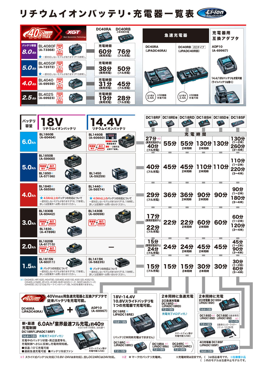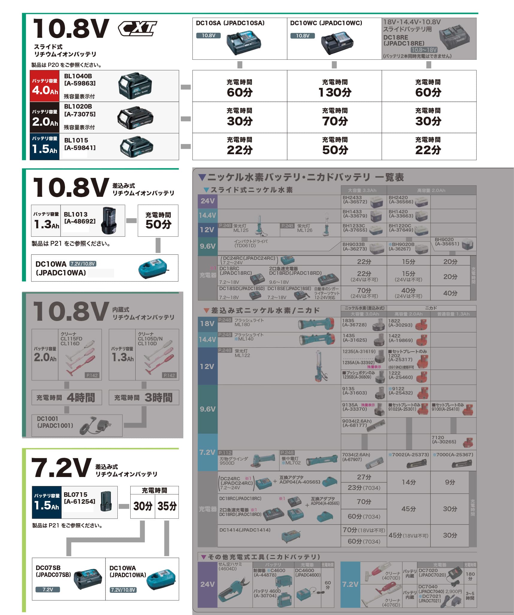 マキタ 10.8Vバッテリ・充電器一覧表