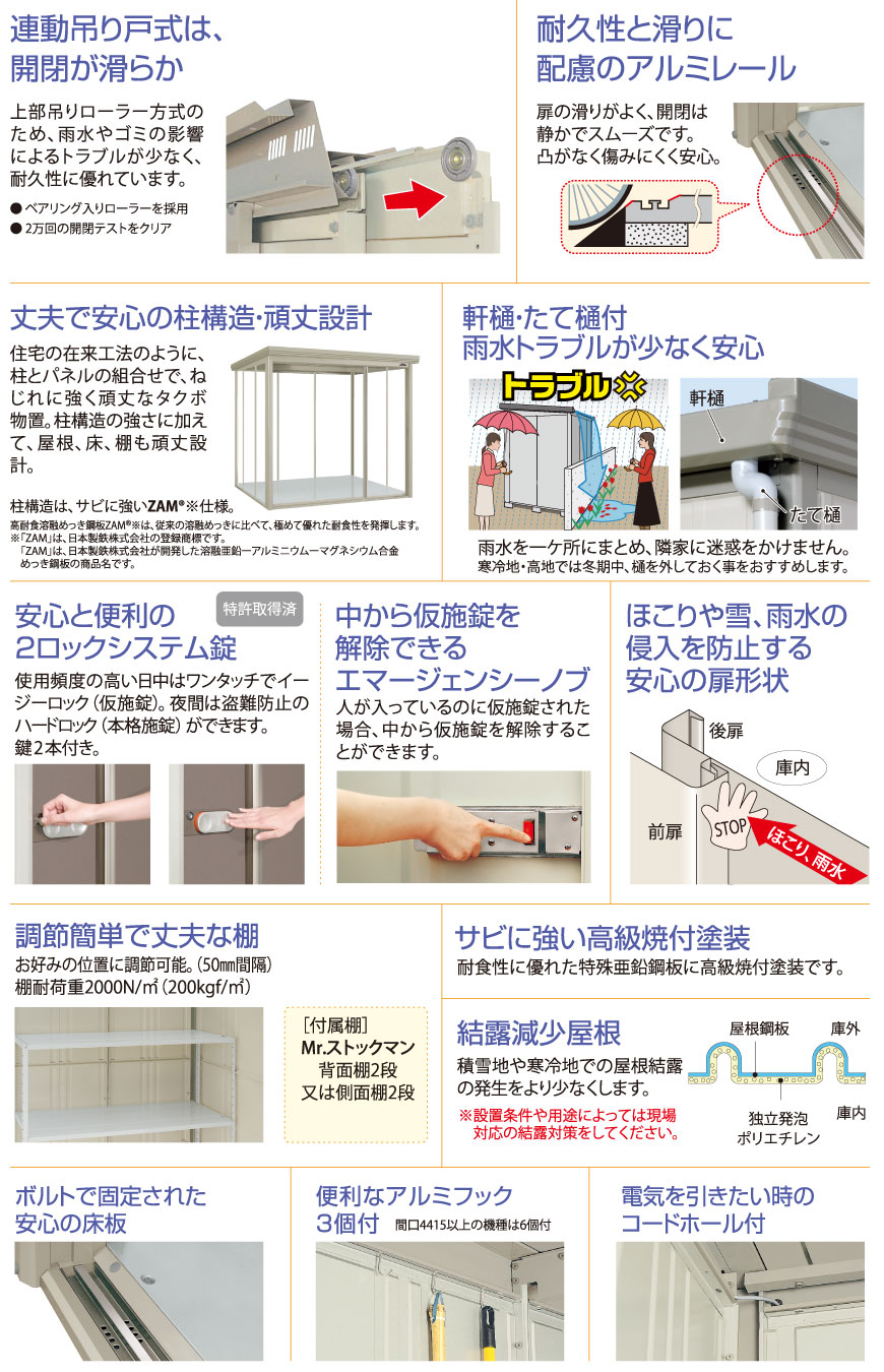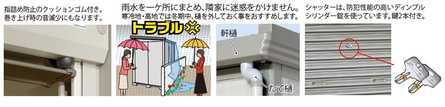 ・シャッターカバーが標準装備。巻き上げた時、庫内に雨水が落ちるのを防ぎます。