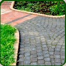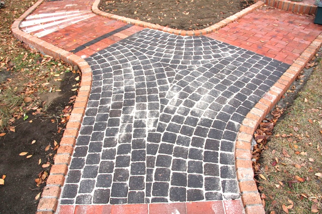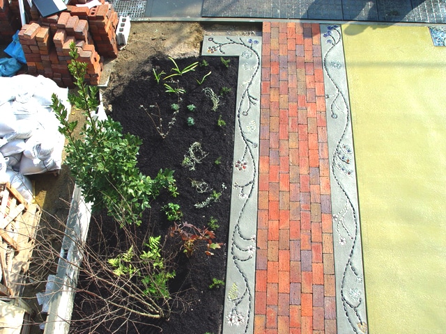長い園路はシンプルなパターンが良い。両端は少し立ち上げて土が園路に流れないようにしている。 |
