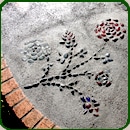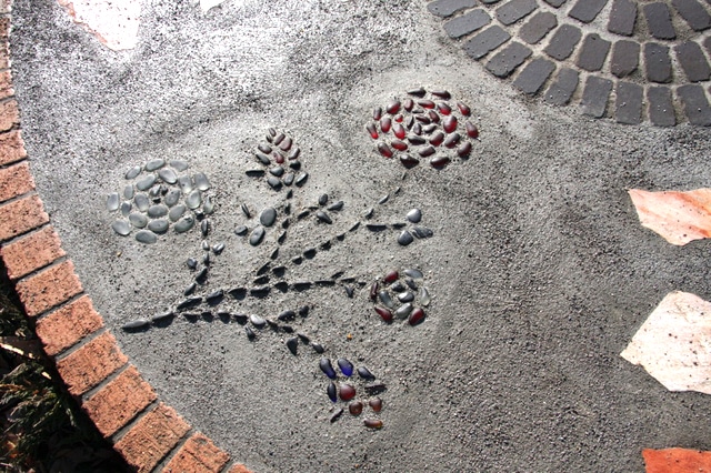 レンガのアプローチ両側にモザイクのボーダーでアクセントをつける。 |