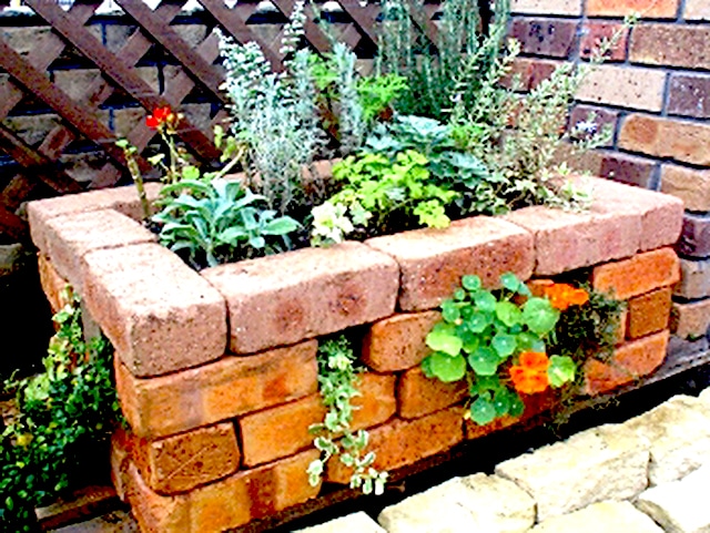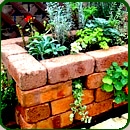 コテージの腰壁や、段差のソイルストップなどでの、レンガの面白い積み方。 |