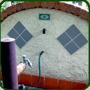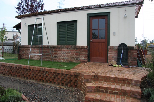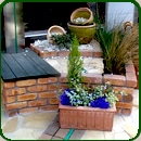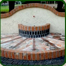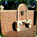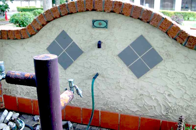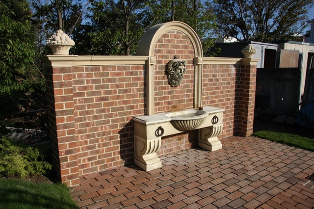 ウォーターフィーチャーの笠部分が、レンガの美しさを際立たせる。 |