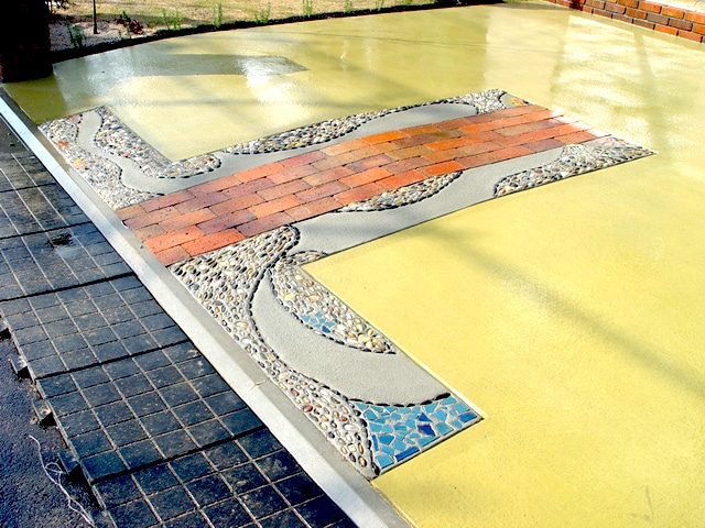 駐車場など広いスペースでは、コストが高くつくので、一部をレンガとモザイクにし、コンクリートは色をつける。 |