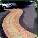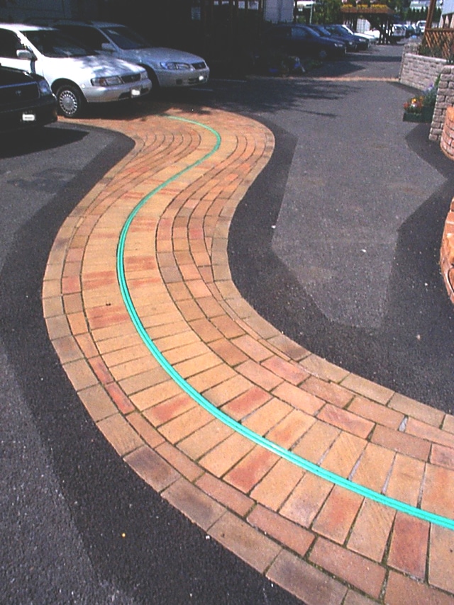 駐車場の一部をレンガ施工。ラインのエンドには、池があるので、その池の流れを表しています。 |