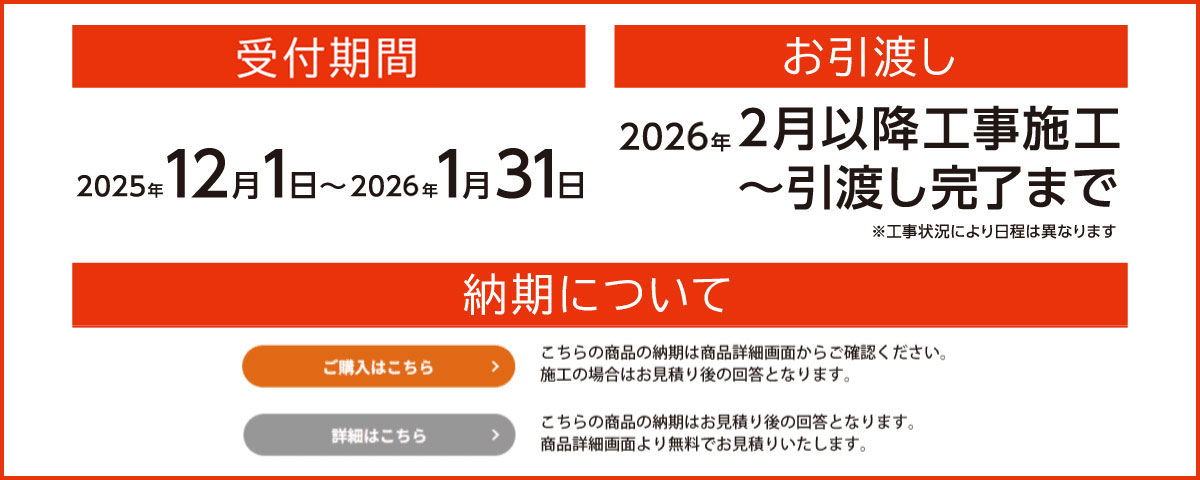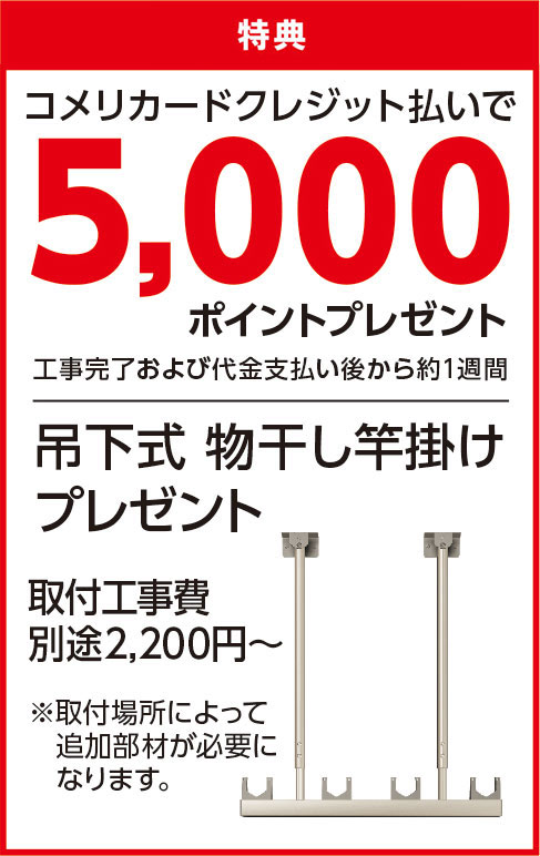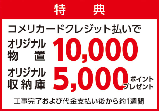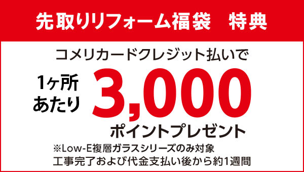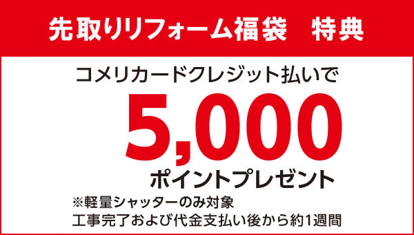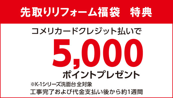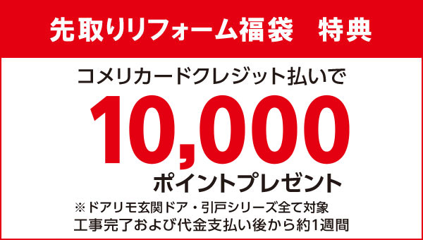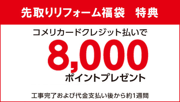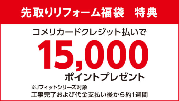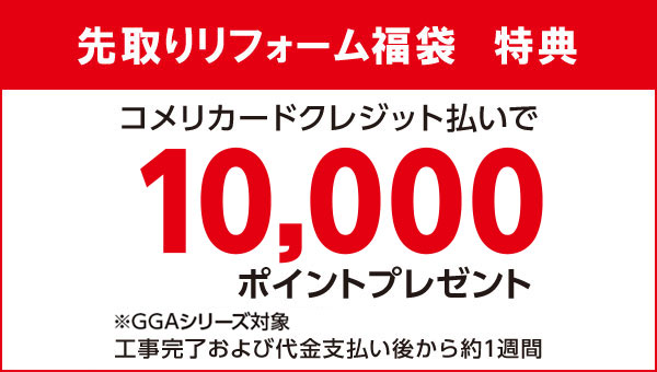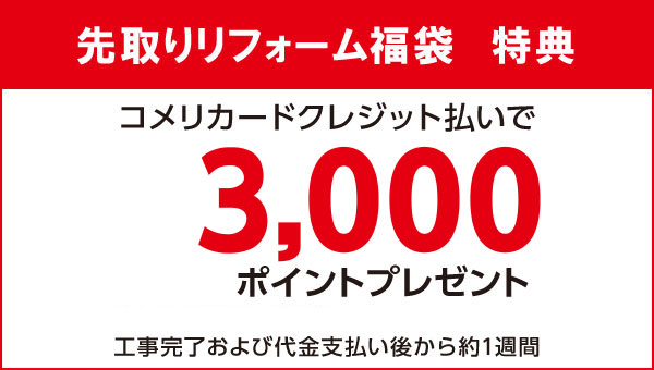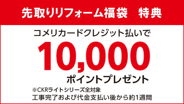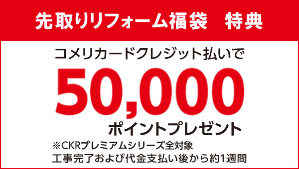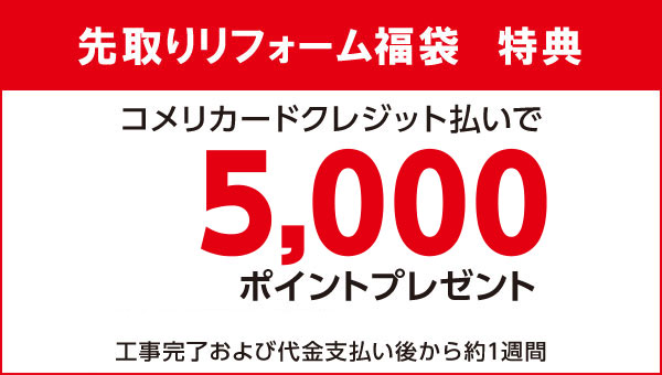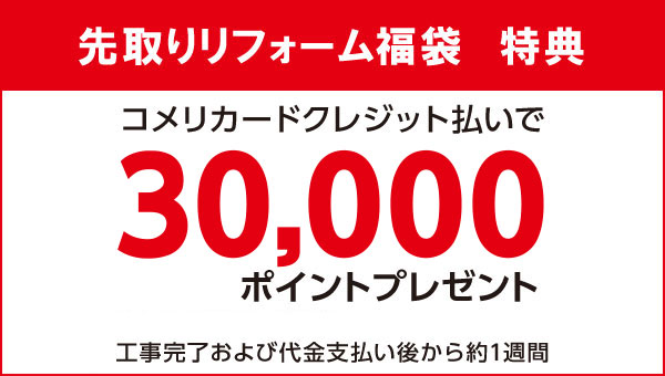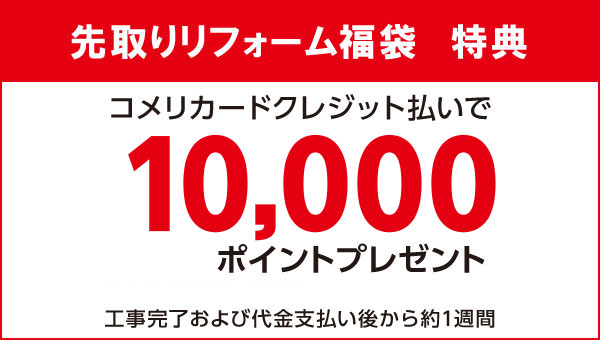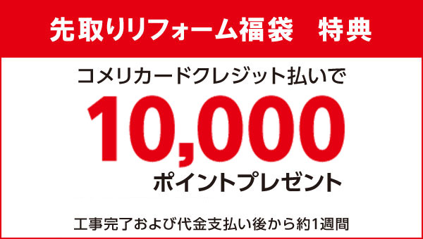 昨年、お客様から大変ご好評いただきました、「先取り」リフォーム福袋」を今年も発売いたします。システムキッチン、システムバス、ビルトインコンロ、IHクッキングヒーター、トイレ、外壁塗装、窓・ドアの取り換え、物置、カーポートなど、各種リフォームをご用意いたしました。期間限定でコメリで使えるポイントやプレゼントが付いた商品など、大変お得なキャンペーンとなっております。