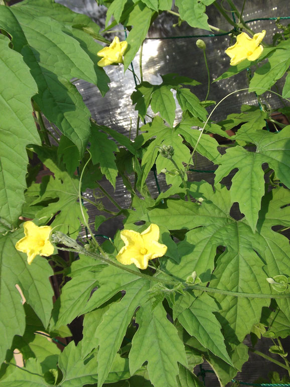 こちらは表からの様子。太陽の光をいっぱい浴びて、大きく葉を広げています。花もたくさん咲きました。