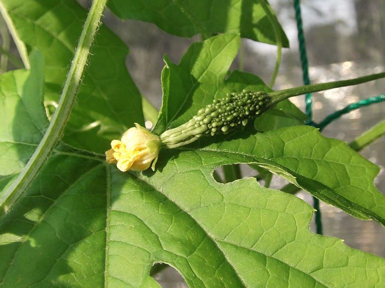 でも、数少ない雌花もちゃんと受粉したようで、ぷっくりと実が膨らみ始めました。こんな小さな時からゴーヤ特有のボツボツがあるんですね。がんばって大きくなってね!