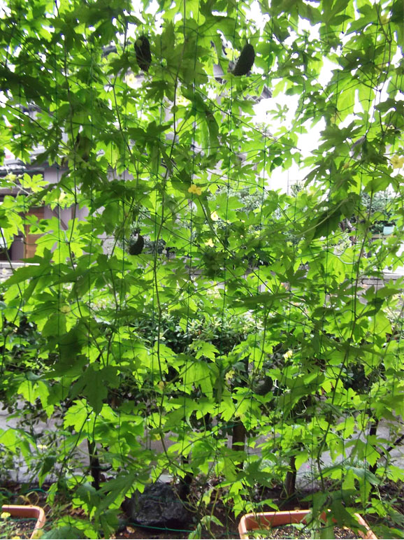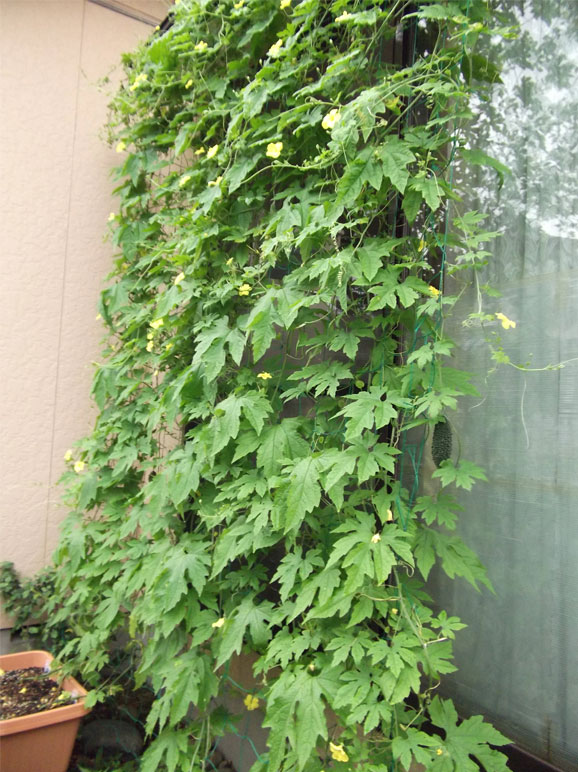 日よけだけでなく花も実も成るゴーヤですが、次々と花を咲かせています。ただ、雄花は20輪ほど咲いたのに対し、雌花は6輪でした。たくさん収穫できるのかはちょっとあやしい?