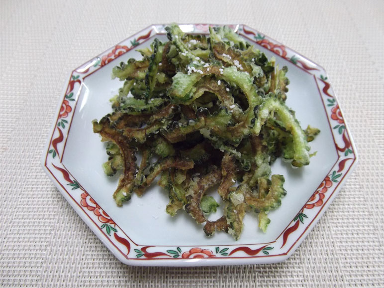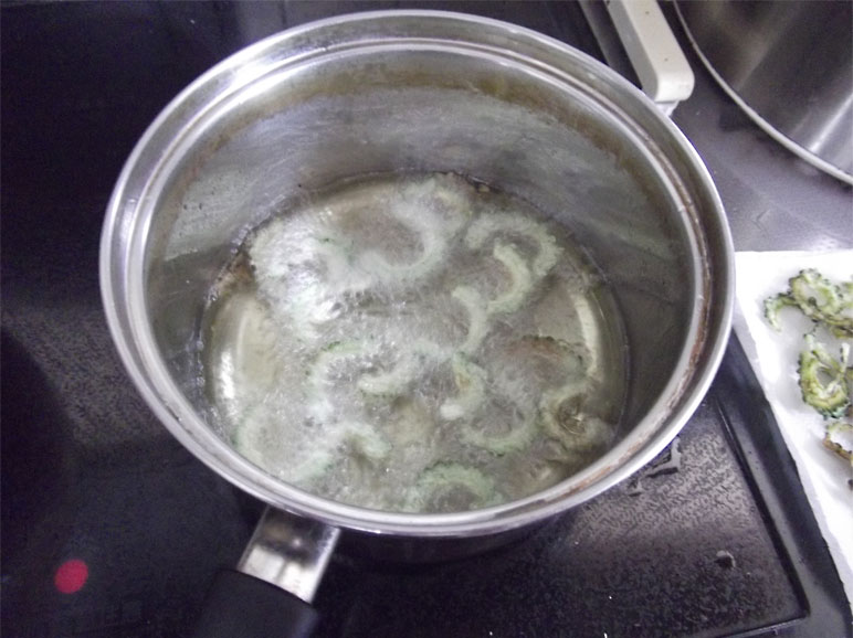 鍋に油を入れ、十分に熱してからゴーヤを入れて揚げます。 油は高温で、ゴーヤが薄く色づくまで揚げるとパリパリになりました。