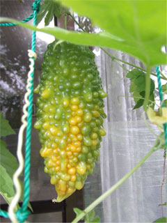 さて、我が家で収穫したゴーヤです。 ゴーヤは表面のイボイボが出てくれば食べ頃だということで、少し小ぶりですが収穫してみました。