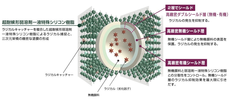 エスケープレミアムルーフSiは無機顔料の表面を高緻密ダブルシールド層でガードすることにより、ラジカルの発生を抑制します。また、超耐候性NADシリコン樹脂により、三次元架橋の緻密な塗膜を形成するとともに、わずかに発生したラジカルもラジカルキャッチャーが捕捉します。