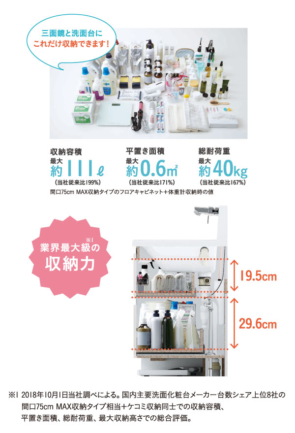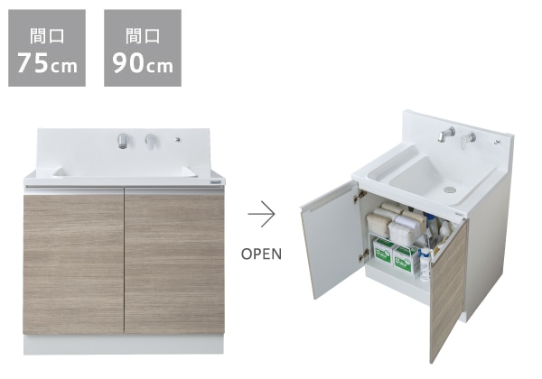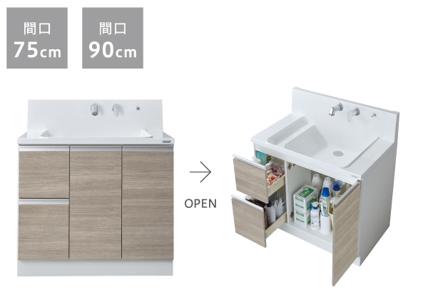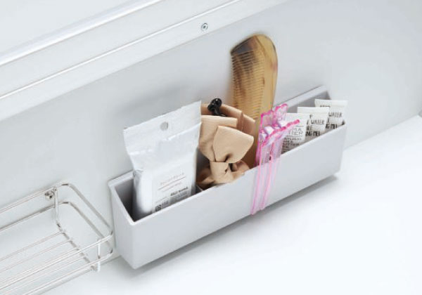 たっぷりかしこく収納できる工夫が満載ボウル手前に生まれたスペースを無駄なく活用。フロアキャビネットの収納力を大幅に向上させました。