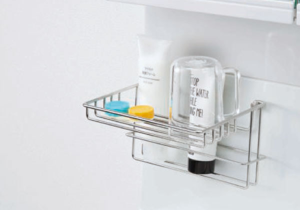 鏡の両サイドは扉のない棚。収納物をサッと取り出せます。