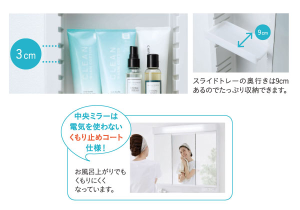 収納するものに合わせて3cm刻みでトレーの高さが変えられるので、効率良くたっぷりと収納できます。コードパスや小物入れなど、使いやすい収納の工夫がたっぷりの三面鏡です。充電等に便利な内部コンセントもついています。