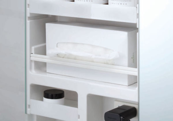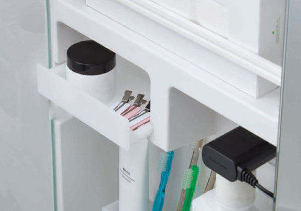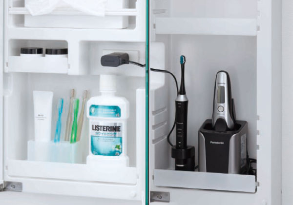 左右収納の仕切りにコードの通りみちを設けました。電動歯ブラシなどがいつもの収納場所で充電できます。