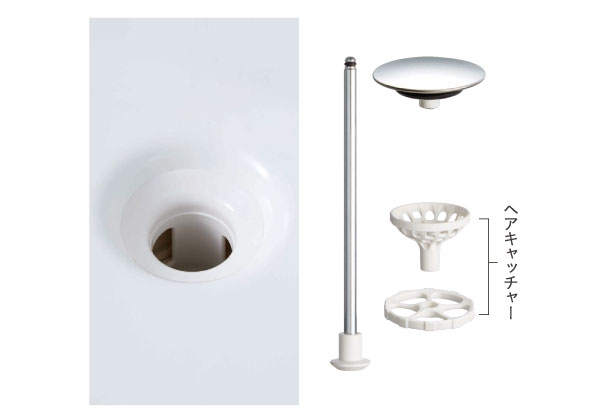 排水口のまわりの金属部分をなくしたすっきり形状。ヘアキャッチャーは分解できるのでお手入れラクラクです。
