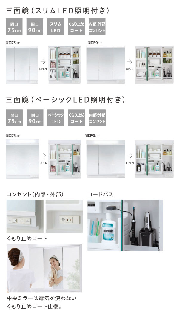 セット販売(施工をご希望の方はこちら) 幅750mm/高さ850mm 3面鏡 スタンダードLED スリムLED 扉