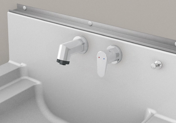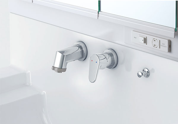 水栓まわりに水たまりができない、壁に直接取り付けるタイプの水栓を採用。すっきりとしたデザインです。