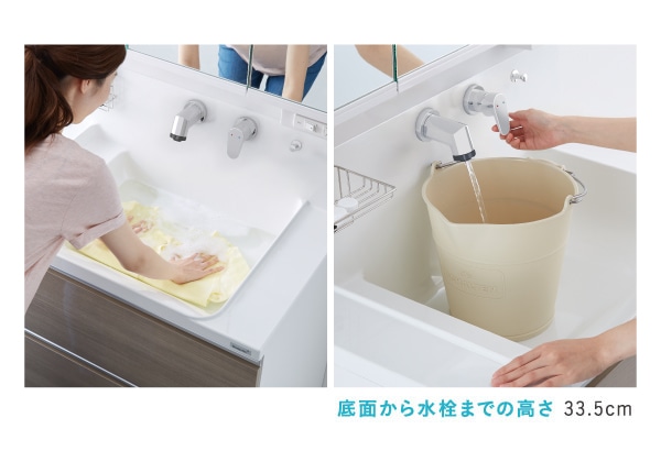 バケツを置いても安定し、容量もたっぷりなので、つけ置き洗いなどにも便利です。