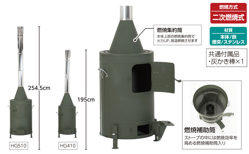 二次燃焼機能で不完全燃焼を防ぎ、有色煙や匂いを抑えます。