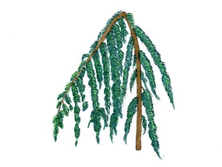 北アフリカやモロッコの高原に分布し、40~50メートルなる高木のアトラスシーダーの枝垂れ性の品種です。必要な高さまで支柱で誘引し、その後枝を放任して伸ばします。幹が太くなってくれば自立できるでしょう。灰青色の葉は美しく、独特な形はコニファーガーデンでもひときわ目立つ事でしょう。