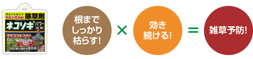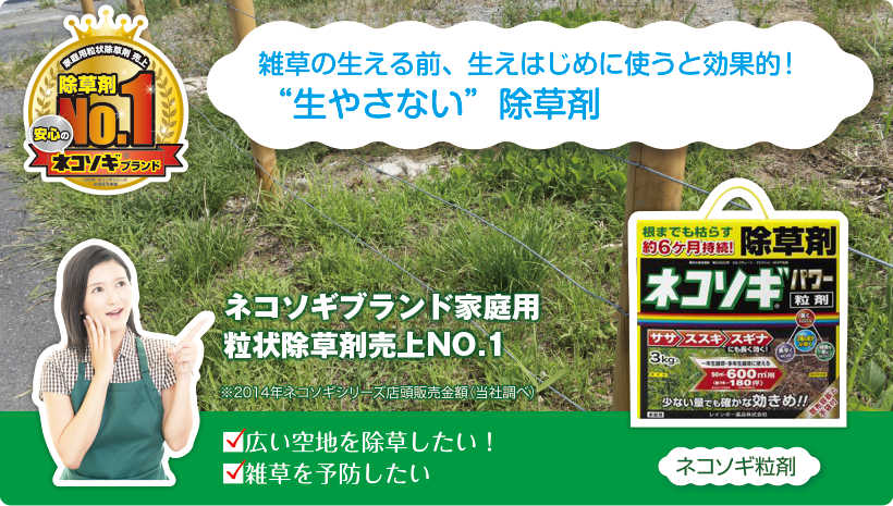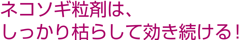 雑草の生える前、生えはじめにはネコソギ粒剤!根までしっかり枯らして効き続けるから、雑草を予防してキレイが続きます。