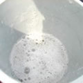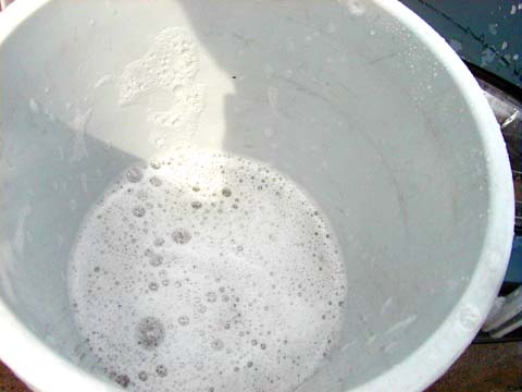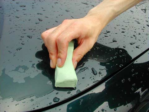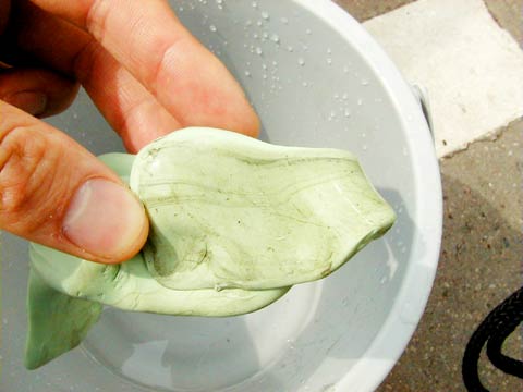 とりあえず水洗い終了。車を移動してボディは濡れたまま「ねんど状クリーナー」でボディをツルツルにしていきます。これは水をつけながら使うので、まずはバケツの水にくぐらせます。 |