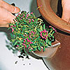 3.植物をポケットの中に差し込みます。山の土をポケットに寄せて、植物を植えます。ポケット全部に植え込んだら、土を足し、普通のギャザリングの要領で他の植物も植え込みます。植物が大きくなることを考え、間隔を空けて配置しましょう。