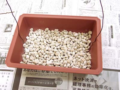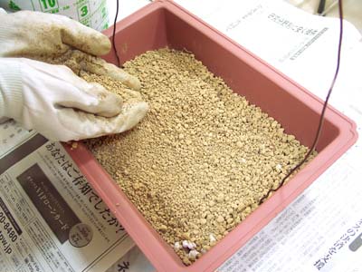 2.用土は赤玉土・小粒、腐葉土、化成肥料(少量)を混ぜて使用します。飾り用に化粧砂(寒水石)も用意します。