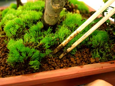 2.割り箸などを使うと扱いやすいです。苔が浮かないように軽く抑えていきます。