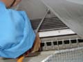 水を噴霧して洗剤を流す作業。汚水はパイプ伝いで