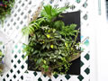 『熱帯の森』と名づけられたこの作品は、濃い緑のリーフ類を使った個性的なもの。この先に何があるんだろう?と葉っぱをかき分けてドキドキ探っていくようなハンギングです。 |