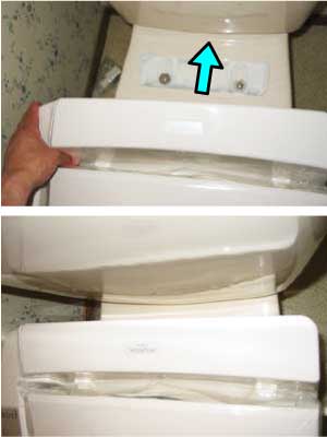 この際、ロータンク内部のボールタップが共回りしてずれてしまう可能性があるので、タンクの蓋を外してボールタップを押さえながらボルトを緩めます。