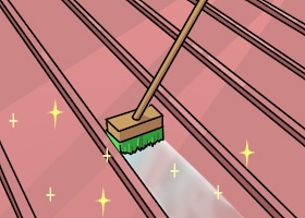 1. 屋根に付いたゴミやサビ・苔などをデッキブラシや高圧洗浄機を使ってキレイに落とします。表面にツヤがある箇所はサンドペーパーなどで表面を荒らしてから塗装してください。