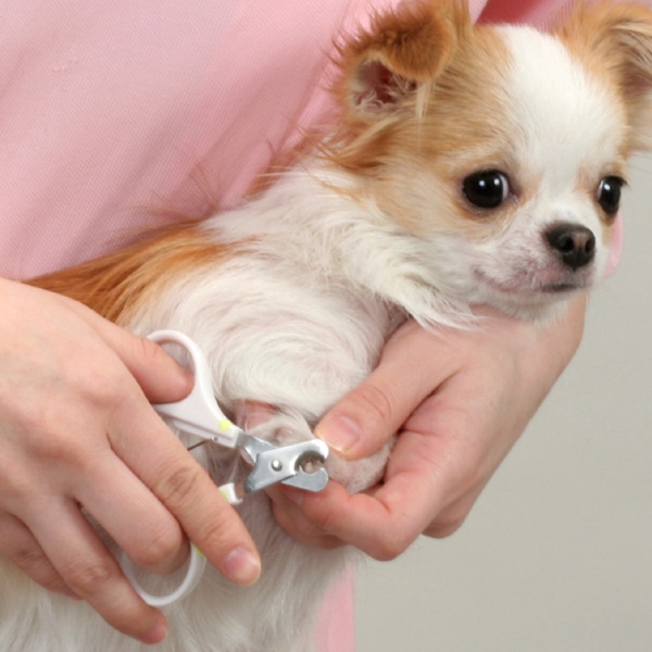 多くのワンちゃんは手先や足先を触られることが、あまり好きではないです。 ですので、爪を切る時にはまず、指と爪を1本1本さわって慣れさせることからはじめましょう。嫌がらないことを 確認しながら、触れては褒める行動を繰り返して良いイメージを持たせます。ワンちゃんを抱え込み、しっかり保 定します。爪は毛で覆われているので、指でおさえてよく見えるようにしましょう。足先を持ちながら爪の根元を押し出し、肉球と爪の付け根をしっかり固定して切ります。